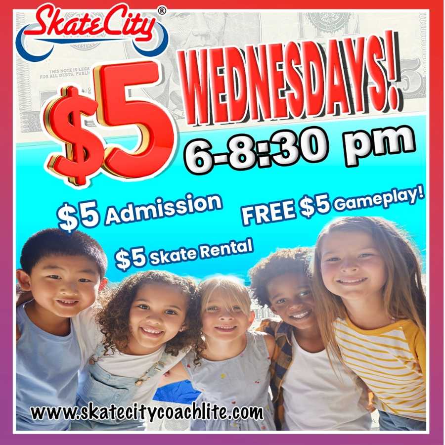 Wednesdays just got a whole lot better at Skate City St. Louis! Join us every Wednesday night from 6:00 to 8:30 PM for our $5 Skate Sessions. This special session features $5 admission, $5 skate rental, and $5 in gameplay with every paid entry.  It’s the perfect midweek break for families, friends, and kids looking for fun on wheels. Don’t miss the best deal of the week and enjoy great music, glowing smiles, and nonstop skating excitement!