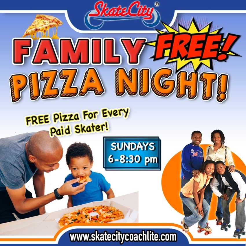 Sunday nights are all about family, fun, and FREE pizza at Skate City St. Louis! Join us from 6:00 to 8:30 PM for Family Free Pizza Night! Every paid skater gets free pizza to help fuel them on the rink. It’s the perfect way to wrap up the weekend with good food, great music, and quality time together. Bring the entire family and make it a weekly tradition! Admission is $8 per skater with $5 skate rental (if needed).