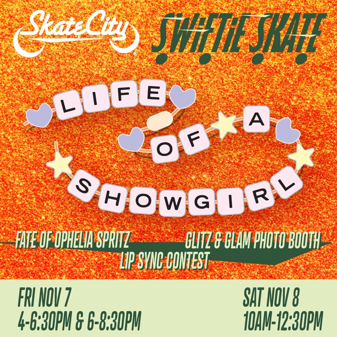 Get ready to shine at Skate City’s Showgirl Era Skate, a weekend of sparkle, music, and Swiftie magic. Enjoy two days filled with glitter, sequins, and your favorite Taylor Swift songs as you skate through the ultimate glam experience. Snap a pic at the Glitz & Glam Photo Booth, sip on a Fate of Ophelia Spritz, and take the stage with your best lip sync performance. Sessions run Friday from 4–6:30 PM or 6–8:30 PM, and Saturday from 10 AM–12:30 PM. Admission is $8 per skater with $5 skate rental (if needed).