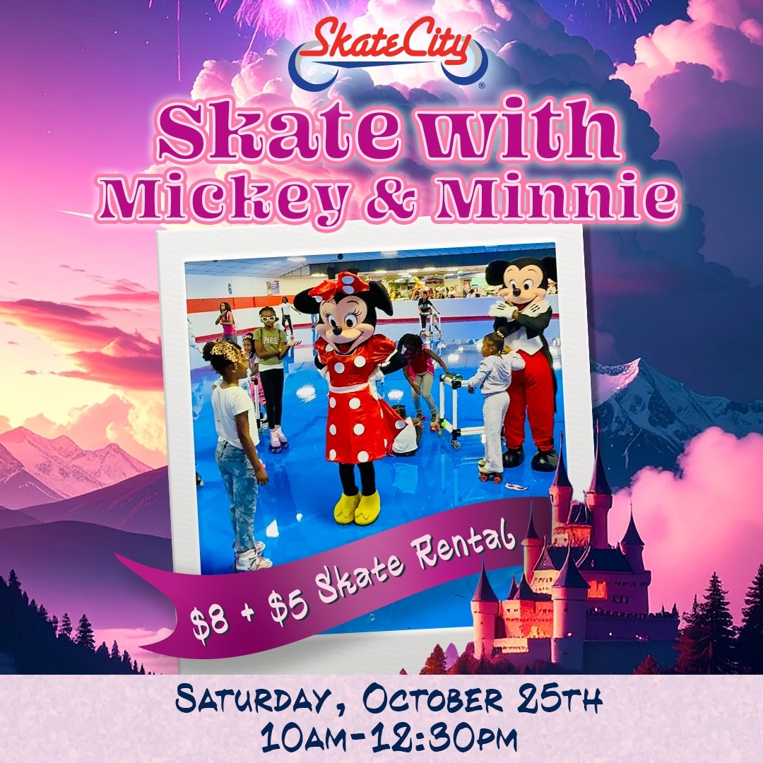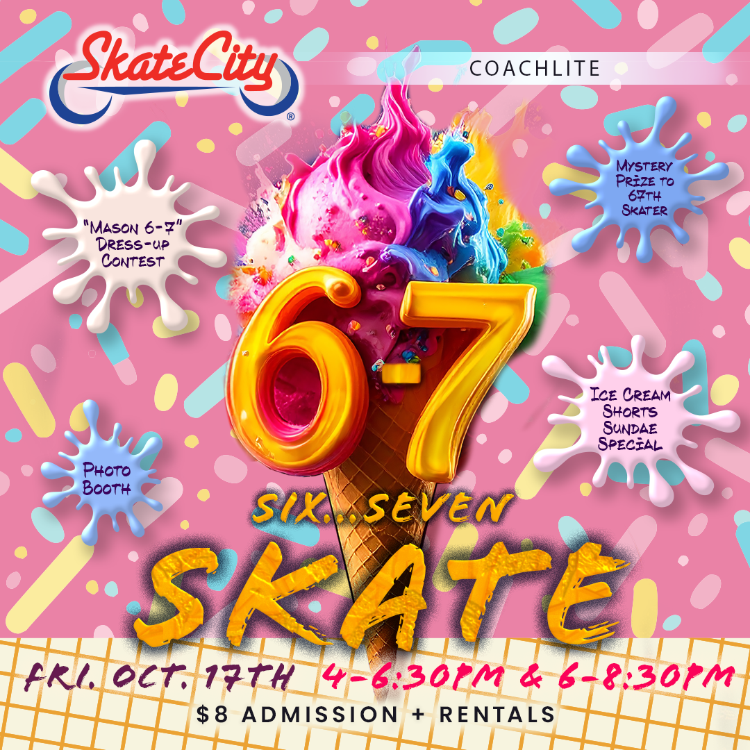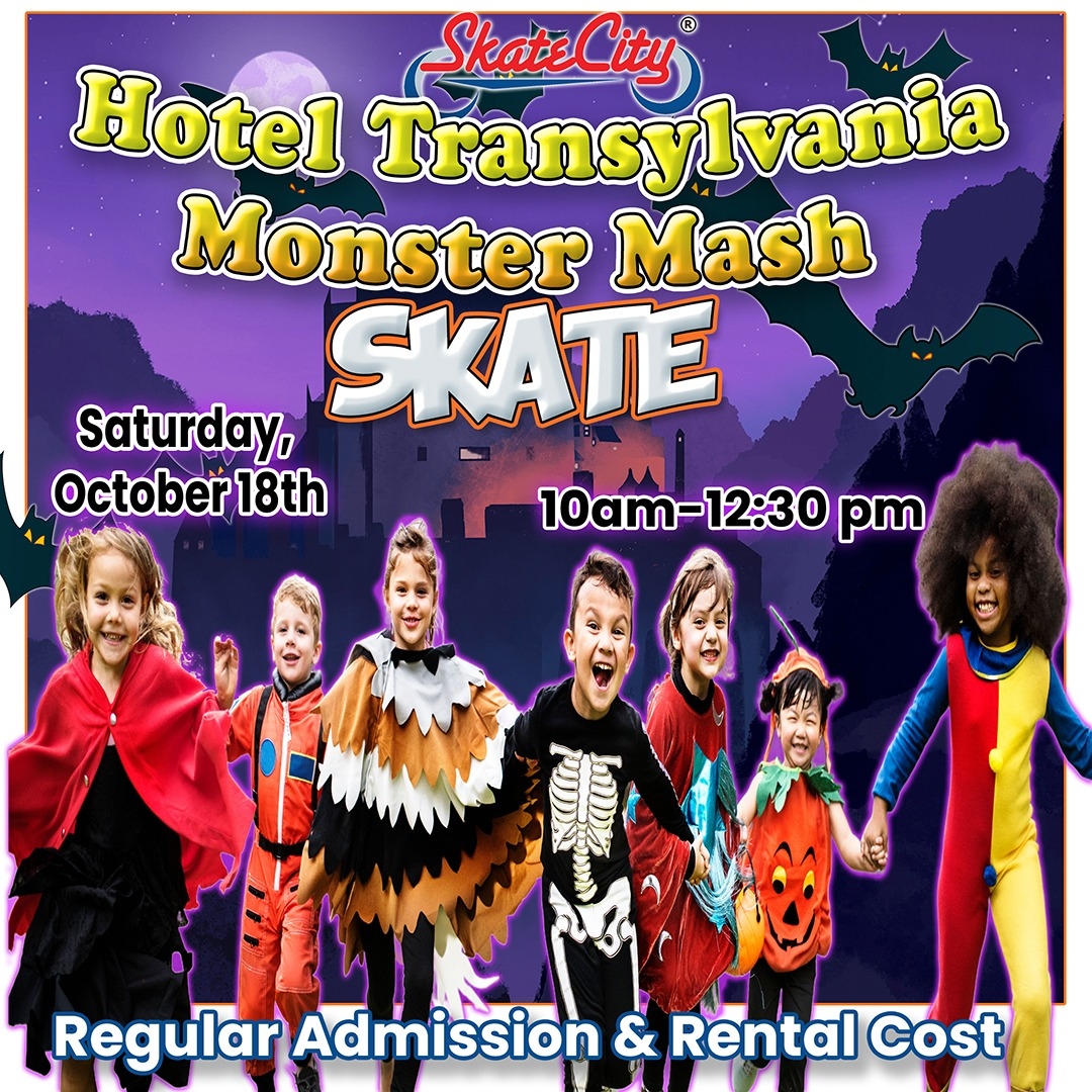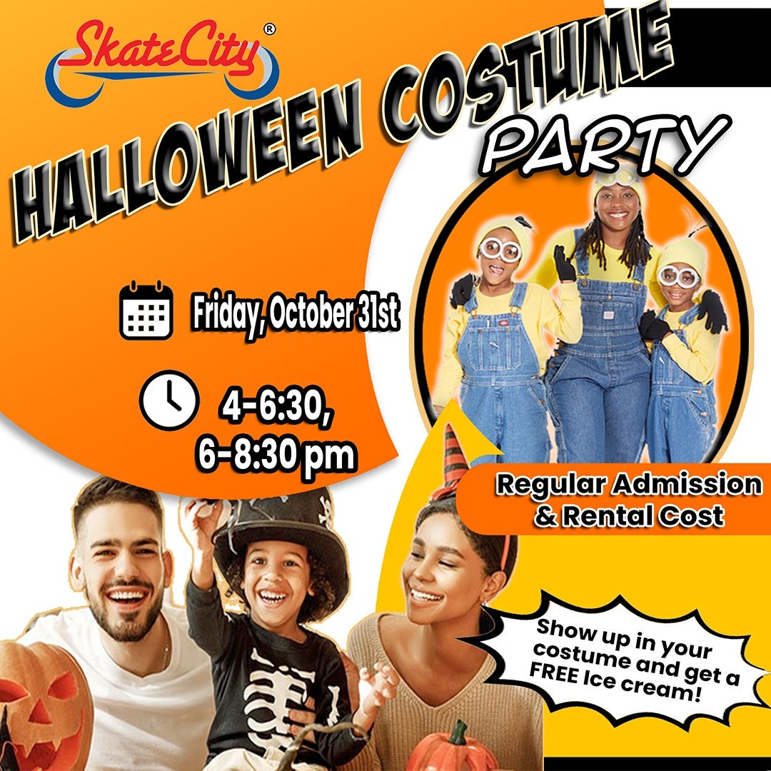 Get your costumes ready for Skate City’s Halloween Costume Party on Friday, October 31st! Skate during sessions from 4–6:30 PM or 6–8:30 PM and enjoy a night of spooky fun, music, and family-friendly excitement. Everyone who shows up in costume gets a FREE ice cream, so bring your best look and roll into the Halloween spirit. Admission is $8 plus with $5 skate rental (if needed).
