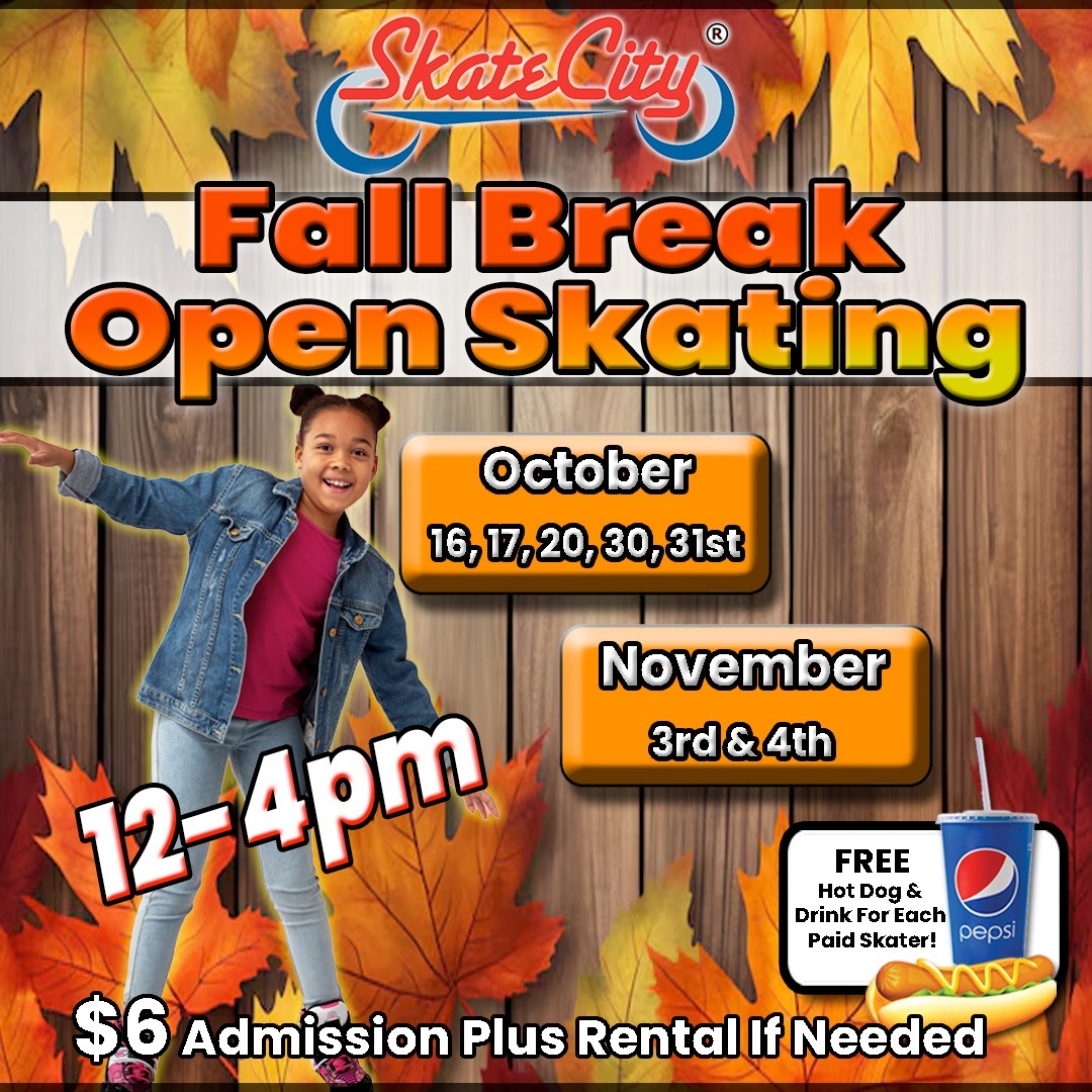 Admission is just $6 plus skate rental if needed, and every paid skater gets a FREE hot dog and drink! Make the most of your fall break with fun, friends, and skating all afternoon long!